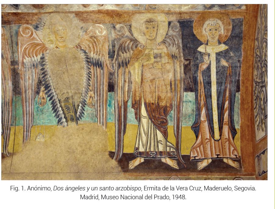 En los autos sacramentales de Pedro Calderón de la Barca se manifiesta específicamente la conexión con el arte pictórico mediante la proyección de lo considerado inaccesible o intangible, «el arte por el arte», y lo potencialmente concreto, el texto escrito que posteriormente será puesto en escena. El teatro, por lo tanto, incorpora ambas formas de expresión puesto que el texto escrito tiene como objetivo último ser representado mediante la perceptibilidad que otorga el arte escénico. «La pasión del orden» en Calderón se puede observar con mayor fijeza en la progresión metódica de los personajes calderonianos que han superado estéticamente la estratificación escénica de lo intangible del linealismo que se ilustra, por ejemplo, en la pintura mural románica que se observa en Dos ángeles y un santo arzobispo. Este mural al fresco fue trasladado al lienzo en 1947 y se trata de una pieza procedente de la Ermita de la Vera Cruz en Maderuelo, Segovia27. Pertenece cronológicamente a la primera mitad del siglo XII y se desconoce su autor (referirse a la fig. 1 en todos los ejemplos en los cuales se mencione esta pintura mural).