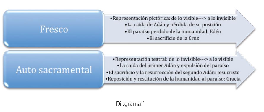 Tanto en el mural de la Ermita de la Vera de la Cruz de Maderuelo, Segovia, como en el auto sacramental La inmunidad del sagrado de Pedro Calderón de la Barca, se procura mostrar a sus respectivas audiencias la posibilidad de determinar a un nivel metafóricamente concreto el misterio de conceptos incorpóreos muy bien matizados en el arte pictórico y magistralmente esbozados en la representación teatral del Corpus Christi. Se transporta al espectador de un concepto puramente abstracto a una vitalidad de acción concreta e inalterable. La escena presente en el fresco del arte mural románico de la ermita se moderniza a través de una «ciencia» teatral en el auto, tal como lo ha indicado Francisco Ruiz Ramón en sus estudios de la dramaturgia calderoniana48. Esta «ciencia» se convierte en la quintaesencia del teatro sacramental otorgando a los lectores y a la audiencia la trascendencia etérea que permanece dentro y fuera de las paredes del teatro áureo. La labor artística y dramatúrgica se realiza a un nivel simbólico y alegórico en diferentes niveles de perfil escénico. En el mural se alegoriza la caída del hombre, el primer Adán al ser expulsado del Edén, y el sacrificio de la cruz mediante la figura de Jesucristo; el auto representa la caída del primer Adán y la reintegración al Paraíso perdido mediante el segundo Adán trasfigurando el sacrificio de la cruz en el personaje de la Gracia. En el mural de la ermita se representa pictóricamente el Jardín del Edén; el auto alegoriza el jardín o paraíso al que es reinstituida la humanidad, el Hombre. Mientras la pintura representa un linealismo inmaterial de la caída de la humanidad, el auto representa una imagen mucho más completa y orgánica de la caída y restauración de la Iglesia a su jardín o paraíso perdido: la fe en la cruz concede la inmunidad de la gracia. Al arzobispo se le denomina «santo» por su condición eclesiástica dentro del mural de la capilla; al Hombre que pertenece a la Iglesia se le considera «sagrado» debido a su inmunidad divina, dentro . fuera del edificio denominado Iglesia. De la misma manera que la figura incorpórea del ángel desempeña el papel de intermediario entre Dios y el mundo, el dramaturgo funciona como el ser omnisciente que reconcilia el misterio sacramental con su audiencia (ya sea ésta religiosa o secular) consagrando así la eficacia etérea del género del auto sacramental dentro y fuera del espacio teátrico.
