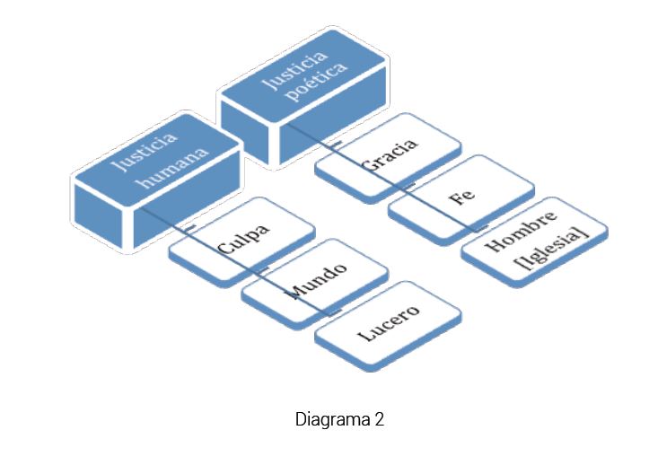 En conclusión y para responder aquí las preguntas que originaron este trabajo: la pintura del fresco transforma linealmente lo visible en invisible; el auto calderoniano esquematiza la caracterización de cada uno de los roles personificando conceptos sacramentales complexos haciendo lo invisible artísticamente visible (Diagrama 1). Dentro de un contexto estrictamente ortodoxo, Jesucristo, el segundo Adán, porta en sí el derecho de perdonar el pecado del personaje del Hombre puesto que de acuerdo al drama de la crucifixión, Jesús ha perdonado a sus propios agresores aún sin que el mesías neotestamentario haya cometido delito alguno. Se restablece el orden mediante la resurrección del inocente. Se evalúa la acción mundana otorgando una justicia terrenal y proverbial con la comparecencia de los personajes ante la Sala de Competencias y el Consejo Real, y se establece la trascendencia ineludible de lo abstractamente imperceptible a través de la visibilidad teatral de la justicia poética. Mientras la justicia humana se intenta obtener a través de los personajes de la Culpa, el Mundo y Lucero, la justicia poética triunfa mediante los personajes de la Gracia, la Fe y el Hombre [Iglesia] (Diagrama 2)49. El triunfo no se efectúa solamente a través de la institución de la Iglesia, sino que requiere también la intervención de Gracia y Fe colaborando directamente con el Hombre50 en el misterio de la salvación. A nivel simbólico, se le brinda a cada una de estas alegorías la misma oportunidad de actuar de acuerdo a su caracterización física y metafísica. Prevalece al final del auto sacramental calderoniano, sin género de duda, la «pasión del orden» humano y divino. Es así como esta pasión por el orden se expresa artísticamente mediante las convergencias virtuales del linealismo en Dos ángeles y un santo arzobispo, y en la caracterización esquematizada, la legitimación de la acción y la trascendencia etérea en la simbología del auto sacramental calderoniano ilustrado en este estudio específicamente por La inmunidad del Sagrado.