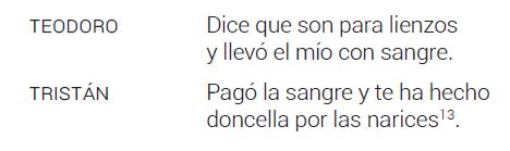 Tal vez el trozo de mayor ambigüedad y el más ilustrativo de la sugestividad sexual (tan frecuente en el teatro de Tirso) es aquel en que la condesa Diana en Castigo le pide a Rodrigo que le ayude a calzar un guante que, según ella, le viene muy estrecho. Dado que la criada Clavela le habrá escogido dichos guantes de entre los pares que la condesa lleva rutinariamente, es muy improbable que no le quede bien en realidad. En un primer momento, Rodrigo no se atreve a tocarle la mano, pero accede a ello bajo las muestras de impaciencia de su señora. Esta, por su parte, le sugiere que la única manera de hacer que el guante no le quede pequeño (entiéndase, que el rango inferior de Rodrigo no constituya un obstáculo a su amor) es que el secretario lo «pique», es decir, según el DRAE, que agujeree la tela para ensanchar el guante con estos huecos. Claró está, sin embargo, que conlleva el sentido secundario de excitar o estimular tanto el sentimiento como el deseo físico22.