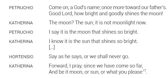 Con tono menos visceral, pero aun así con actos físicos y momentos de contacto carnal, Aurora en Quien calla juega con su maestresala. Tras pedirle un búcaro de agua, lo regaña porque ha encargado la entrega a una criada, a lo cual responde Rodrigo que, de acuerdo con las reglas de cortesía en las que insiste Aurora misma, «[e]n palacio, ya sabéis / ser costumbre que una dama / sirva siempre a su señora / la copa»14. Desprovista de un pretexto para objetar, la marquesa finge encontrarle al agua un gusto a sal, de manera que acusa a Rodrigo de no haberla probado. Este acepta la culpa que no tiene, aunque sí la ha probado y no le ha parecido mal. Al insistir la marquesa en que el maestresala la vuelva a probar, Rodrigo echa un poco del agua a una salvilla o platito, para evitar beber del mismo barro que han tocado los labios de su señora. Ésta le espeta en cara: «¡Qué escrupuloso que estáis!» Rodrigo, sin dar en el humor de la soberana, repite que el agua no le sabe a sal, lo cual le permite a Aurora dejar entrever su sentimiento: «Siempre os sabe bien a vos / lo que a mí me sabe mal»15. Ante la continua insistencia de que el agua está hecha «una salmuera», Rodrigo se ingenia la siguiente respuesta: que el búcaro o copa hadado el sabor a sal. Para poner a prueba tal hipótesis, se ve obligado, no sólo a beberdel búcaro, sino a asentir a la afirmación de la soberana: «El barro la sal ofrece./ Justamente me culpáis»16. Tal imposición de la «verdad» a través de la autoridadse halla en forma más brutal en The Taming of the Shrew de Shakespeare, dondelos papeles de los dos sexos se conforman más a lo tradicional. Tras hacerle pasara Katherina una noche de bodas sin dormir, el novio Petruchio hostiga a su esposade la siguiente manera:
