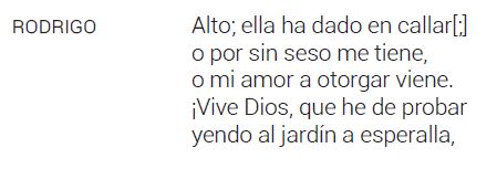 En la segunda comedia que protagoniza, Rodrigo se resuelve a no dejar escapar su segunda oportunidad. Al recibir una serie de mensajes de la marquesa Aurora, unos subliminales y otros más abiertos, decide declararse, aprovechando la ocasión de un papel que la soberana necesita escribir a su supuesto prometido, el conde Carlos. Con alarde sumamente conceptista, Rodrigo compone una carta en versos de arte mayor que, al cortarse por la mitad en sentido vertical, produce dos cartas (en la primera, todos los hemistiquios iniciales; en la segunda, todos los finales). La primera media carta contiene una declaración de rechazo hacia el conde Carlos, mientras que la segunda transmite los deseos amorosos de Rodrigo, junto con una súplica de que ella se declare una vez por todas. Aurora, incitada por la misma vergüenza señorial que había manifestado Diana, no responde más que lo siguiente: «Buenos están los papeles. / Mucho sabéis, don Rodrigo»26. Este, no obstante, decide acertadamente en la segunda ocasión fiarse del dicho de que «quien calla otorga»: