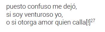 La ambigüedad de los mensajes se extiende a veces a la identidad del destinatario. Los dos casos principales de este último fenómeno dan pie, casualmente, a los títulos de El castigo del penséque . Quien calla otorga. En su aventura desastrosa en Flandes, el protagonista, en su cargo de secretario de Diana, se ve obligado a apuntar un mensaje dictado aparentemente al conde Casimiro, cuyo tenor es que el amante favorecido se reúna con ella a medianoche en el jardín. Al terminar el dictado, la condesa le manda que entregue la misiva «a quien sabéis / que me quiere más que a sí»23. Rodrigo se ve aludido en esta expresión, pero también sabe que Casimiro ama con fervor a la aristócrata, de manera que supone (aquí entra el error del penséque) que el mensaje va dirigido a su rival. Su modestia inherente lo impulsa al siguiente raciocinio: