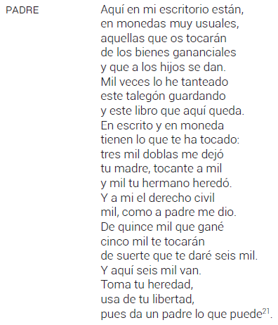 Se entiende por tanto que al morir la madre dejó en herencia tres mil monedas, las cuales, según la ley de la época se repartía de manera equitativa entre los miembros de la familia: «El derecho común castellano es un derecho que tiende al reparto igualitario de la herencia entre todos los hijos e hijas. […] Establece una serie de derechos para los miembros de la misma en su calidad de tales. Al pater familias le corresponde decidir cómo desea partir la herencia»22. Además, el caudal del padre en el momento del reparto consta de quince mil monedas, de las cuales hace ya el reparto en vida23, volviendo a repartir en partes iguales, con lo que obtiene cinco mil más. Así, por tanto, finalmente el dinero que recibe Pródigo son seis mil monedas de oro para comenzar su viaje. Todo este reparto que nos puede parecer injustificado está recogido legislativamente en las leyes del Toro de 1505. Hay que señalar también que, pese a las quejas del hermano mayor sobre favorecer los caprichos del pequeño, el reparto es, en todo momento, justo en todos los aspectos, percibiendo ambos la misma cantidad.