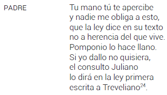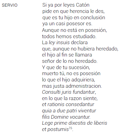 Así su padre justifica la entrega de su parte correspondiente de la herencia como voluntaria, pues las leyes recogen que no está obligado a repartir su herencia en vida. Para ello se sostiene en dos pilares del derecho romano como fueron Pomponio y el consulto Juliano. También Servio tirará de autoridades y citas latinas de derecho para terminar de convencer al padre de su amo.