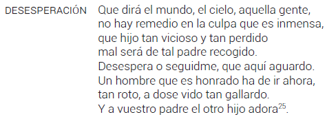 En Remón tan solo aparecen dos figuras alegóricas: Confianza y Desesperación. Sin embargo, aparecen no en un espacio físico, sino a través de un sueño, con lo que su aparición está justificada y no se aleja del realismo que pretende imprimir a la obra. Este espacio onírico se produce cuando Pródigo lo ha perdido todo y está trabajando como porquerizo. En un momento, por el cansancio y el hambre, cae dormido y ambos personajes hacen su aparición. Desesperación, como el nombre indica, intenta que se olvide de todo y que cargue con la culpa de mal hijo al haber abandonado su hogar y su familia por un deseo egoísta. Le recuerda que está condenado y no puede regresar, sobre todo después de haberlo perdido todo por culpa del pecado: