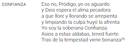 Confianza, por su parte, intenta hacerle entrar en razón haciéndole ver la bondad del padre que espera el regreso del hijo perdido: