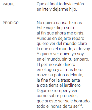 Los autos sacramentales que tratan esta parábola, por su parte, parecen querer profundizar en las motivaciones que llevan al hijo a marcharse de casa. En el auto de Lope de Vega, Pródigo se cansa de la vida familiar y de las obligaciones del campo. Motivado por su criado, de nombre Juventud, decide marcharse a ver mundo, ya que en la casa de su padre no se siente libre. Entra aquí el libre albedrío, el cual le lleva a exigir a su padre su parte correspondiente a la herencia materna y, desobedeciendo los consejos de su progenitor, comenzar su viaje. En este auto está clara la influencia que ejerce el criado sobre su amo desde un primer momento, motivándole al pecado. Además, como señala Amparo Izquierdo: «Lope plantea el enfrentamiento entre los hermanos opuestos, reflejo de la relación entre Caín y Abel»13. El protagonista de este auto está decidido a cambiar de vida para disfrutar de los placeres que el mundo le ofrece, pero siempre desde una perspectiva despreocupada e irreflexiva, rasgos propios de la Juventud que le aconseja. No obstante, acaba arrepintiéndose cuando es consciente de la situación en la que se ve abocado.