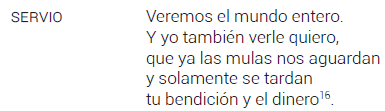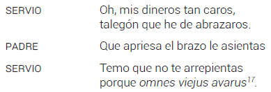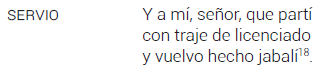 Además Servio, por lo que parece, es el motor primero de toda la acción. Si bien es Pródigo quien se presenta ante el padre para pedir la herencia para el viaje, se insinúa que el criado es quien le motiva a ello por intereses personales.