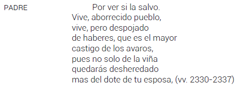 Hace mención al hecho histórico de que habiendo rechazado el pueblo elegido al Mesías, los judíos perderán su libertad y sus bienes y, además, la salvación que Cristo ha realizado será aprovechada por la Gentilidad. Es interesante comprobar el adjetivo que utiliza Calderón —avaros— para referirse al pueblo judío. La misma calificación peyorativa la encontramos versos más adelante: