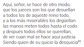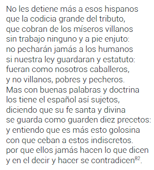 Los discursos más representativos de esta crítica son, por una parte, aquel que Diego Arias puso en boca de Pailamacho, y por otra, el que en Las Guerras de Chile fue pronunciado por un cacique chilote a los navegantes holandeses que habían arribado al sur de Chile. En este último, el indígena criticaba a los españoles por los errores propios de conductas excesivas y antinómicas de una conducta épica o heroica: los españoles habían caído en la soberbia, la arrogancia y la codicia81. Aún más severa era la crítica pronunciada por Pailamacho en Purén Indómito, cuando el cacique reunía las tropas para fortalecer y justificar el levantamiento comenzado con la muerte del gobernador Oñez de Loyola: