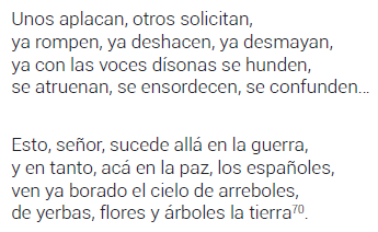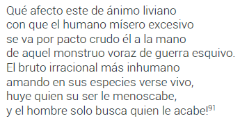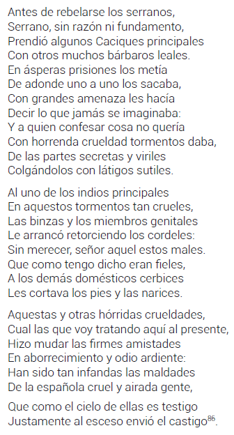 En esta octava, el poeta no reconocía a la violencia como algo inherente a una condición bárbara anterior a la civilización, sino como una propiedad del ser humano que no se condecía con su racionalidad. Por eso, los españoles podían llegar a ser tan violentos, crueles o injustos como los mismos bárbaros. Las críticas inherentes en Purén Indómito y Las Guerras de Chile, así como el retrato de los indígenas como bárbaros salvajes, formaron parte de un discurso amplio que se hizo cargo de los abusos cometidos por conquistadores y encomenderos, y que los responsabilizaba por el levantamiento de los araucanos, entendido más en una condición de venganza que de rebeldía92.