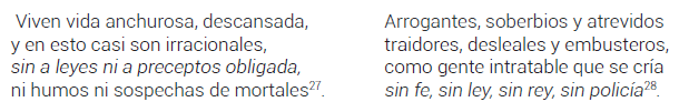 La posterior enumeración de los Diez Mandamientos por el mismo cacique, quien confrontaba estas leyes con las incoherencias practicadas por los españoles, demostraba que los indígenas ya no se hallaban en desconocimiento del dogma cristiano. Los bárbaros, por lo tanto, no podían definirse aún como los ignorantes de Dios. Bárbaros sí eran los idólatras, pero esta vez, plenamente conscientes de su condición y poseedores de todas las características que pudieran derivarse de su apostasía: eran crueles, vengativos y prácticamente bestiales83.