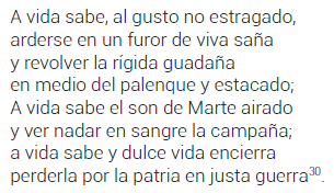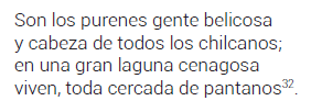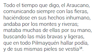 Y si a alguno le pareciere que me muestro algo inclinado a la parte de los araucanos, tratando sus cosas y valentías más estendidamente de lo que para bárbaros se requiere, si queremos mirar su crianza, costumbres, modos de guerra y ejercicio della, veremos que muchos no les han hecho ventaja […]. Y, cierto, es cosa de admiración que no poseyendo los araucanos más de veinte leguas de término, sin tener en todo él pueblo formado, ni muro, ni casa fuerte para su reparo, ni armas, a lo menos defensivas, que la prolija guerra y los españoles las han gastado y consumido, y en tierra no áspera, rodeada de tres pueblos españoles y dos plazas fuertes en medio della, con puro valor y porfiada determinación hayan redimido y sustentado su libertad...15