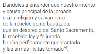 Arauco Domado, el poema más afín a la causa española, reforzó de la misma manera la legitimidad de la empresa. El pueblo araucano, que «más levantado y más soberbio estaba»50, debía ser sometido nuevamente al orden cristiano. La misión de García Hurtado consistía primero en evangelizar51. Por tanto, no se trataba de iniciar una nueva campaña de conquista, sino de sofocar una rebelión.