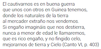 Sin embargo, este discurso se viene abajo cuando los cimarrones le recuerdan que ya no es la misma época que antes: ahora, el rey los ha reconocido y viven libremente bajo su autoridad. Como recuerda Sánchez Jiménez, «técnicamente […] ya no son cimarrones»29. Y, de todas formas, los africanos del poema de Lope apoyan el sistema esclavista, con dos argumentos que Baltasar Fra Molinero recuerda como muy característicos de la época: las distintas naciones africanas se hacen la guerra entre sí y se venden como esclavos y el traslado a América es una mejora porque va acompañado de la evangelización30. Es lo que don Luis de Mazambique le explica claramente al embajador inglés: