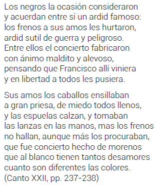 Pocos años después, otros relatos, entre los cuales algunas octavas reales épicas que estudiaré más adelante, se hacen eco del alboroto que se produce en las comunidades negras limeñas al paso del corsario Drake por el Callao. Parece que los esclavos negros traficaron las espuelas y los frenos para que sus amos no pudieran controlar las monturas al salir huyendo o a pelear. Las autoridades coloniales mandan varias cartas alarmistas a España para denunciar la situación y pedir más recursos, como la carta siguiente mandada por el cabildo de Panamá en abril de 1577: