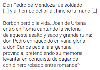 El duque de Borbón fue un actor clave en el saco de Roma, pues se dice que su muerte, ocurrida el 6 de mayo de 1527, precipitó, ese mismo día, la toma de Roma por parte del ejército de Carlos V: frente a esto Juan de Urbina debió asumir el mando de las tropas, pero no pudo evitar la irrupción vandálica de la soldadesca en la ciudad. Ahora bien, la connotación de Pedro de Mendoza a través de la codicia y la soberbia y su filiación con el saco de Roma es el paso inicial para asociarlo, mediante un entramado retórico complejo, con el tópico del cerco de Jerusalén. El hambre padecida por la armada mendocina se liga con el castigo divino23 en torno a la figura del adelantado porque este había formado parte del ejército que asoló Roma y, ya en América, —he aquí un elemento nuevo, tomado del ámbito local— fue el responsable de la ejecución sin juicio del capitán Osorio. El análisis del pasaje descripto por Centenera en el Canto IV de su Argentina muestra, además, que el Romance de Luis de Miranda fue la principal fuente utilizada.