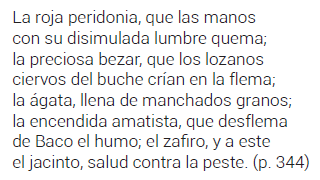 Dejando aparte que sí se usan otros epítetos en el pasaje (Sangley medroso; gallardo scita) se interpreta mal incultos que no significa aquí ‘torpes, necios’, sino ‘silvestres, no cultivados, salvajes’, no necesariamente en sentido peyorativo, sino meramente descriptivo. Pero en todo caso lo que sería necesario anotar es la maravillosa piedra bezar (más bien una bola de pelo y otros materiales que se solidifica en el estómago de algunos rumiantes) que se consideraba antídoto universal y remedio especial contra ciertas enfermedades, como la melancolía. Nicolás Monardes en su Historia medicinal es figura clave para la historia americana de la bezoar, al incluir en la segunda parte de su libro (aparecida en 1571) una carta del conquistador Pedro de Osma, que había descubierto bezoares en animales andinos. En la versión final de 1574 ya trata en extenso las bezoares americanas en comparación con las orientales. Entre otros autores Cristóbal de Acosta, Bernardo de Vargas Machuca, Juan de Cárdenas, Carolus Clusius, Caspar Bahuin…, tratan de las virtudes de la piedra bezar —Bahuin le dedicó incluso un tratado particular—. Los jesuitas mostraron mucho interés por el asunto: José de Acosta y Bernabé Cobo comentaron las bezoares americanas en sus libros56. En una serie de piedras el mismo Balbuena la califica de «preciosa bezar», en El Bernardo: