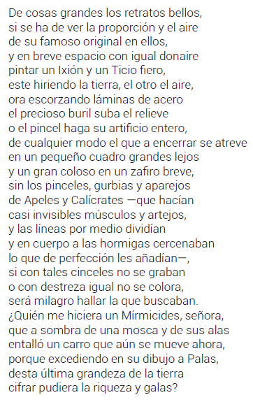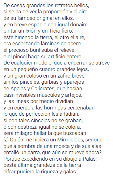 Vayamos a los tercetos. Se podrían parafrasear, señalando la sintaxis, de la manera siguiente: «Los retratos de cosas grandes, si quieren guardar la proporción del original y pintar esas cosas en breve espacio (bien en escultura y grabados en acero manejando el buril, bien en cuadros de pintura manejando el pincel), sea cual fuere la técnica elegida, haría falta tener la habilidad de Apeles y Calícrates, que eran capaces de pintar líneas sutilísimas (Apeles) y esculpir hormigas microscópicas (Calícrates); pues bien, esos retratos si no se graban con esos cinceles o no se pintan con esos pinceles, será milagro hallar la proporción que buscaban. Ojalá fuera yo Mirmícides, —que fabricó un carromato perfecto tan pequeño que se podía cubrir con las alas de una mosca—, para ser capaz de expresar en este pequeño poema toda la grandeza y perfección de México»