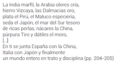 Por mucho que Balbuena elogie a México y por mucha importancia que la urbe alcance difícilmente podría ocupar en la concepción histórica de un letrado del Siglo de Oro el mismo nivel que las regiones prestigiadas por un transcurso histórico más antiguo y amplio: esto es, que para un español (europeo) del XVI y XVII las Indias apenas acababan de entrar en la Historia, carecían de un currículum que pudiera aquilatar su categoría de centro del universo. Cuando Balbuena, en el capítulo V, «Regalos, ocasiones de contento» habla de la abundancia, y de esta unión del oriente y occidente que se da en México no se refiere a una supuesta supremacía y condición cósmica central, sino a algo mucho más prosaico y práctico —no menos importante—: a la riqueza y variedad de las mercancías que llegan a la ciudad y su papel como centro mercantil global. Si en México se junta España con la China es porque el Galeón de Manila (o Nao de la China) hacía un famoso viaje anual (o dos) desde Acapulco, y muchas mercancías de oriente llegaban a México: