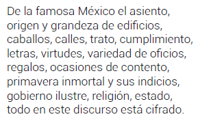 A este fin, por ofrecer a vueltas de los magnates mi puño de agua, hice un elogio en canciones celebrando su venida y dedicándole la Grandeza mexicana