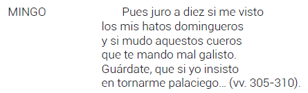 Pues bien, el rústico mostraría este atuendo pastoril en escena hasta que anuncia que «el hato quiero mudar» (v. 373). A continuación, Mingo se enfunda sus prendas más vistosas, que son motivo de elogio por parte de su compañero: