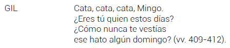 Parece que Gil se sorprende verdaderamente del gran cambio de Mingo porque está irreconocible y porque, además, parece mostrarse bien ataviado. Así, lo primero que percibe Gil del conjunto palaciego de Mingo es la capa de gala, puesto que es la prenda que se pone sobre todas las demás: «¡Qué buen capuz colorado!» (v. 414)12. Es interesante, además, que se especifique que es «colorado», puesto que es «color festivo y dominguero» (Cov.), hecho que encaja perfectamente con este contexto de alegría.