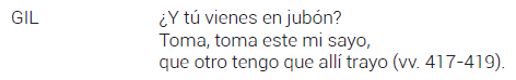 Después de la alabanza del capuz por parte de Gil, Mingo procedería a retirarse la capa para dejar al descubierto el resto de su atuendo. Así, muestra, en primer lugar, una prenda semi-interior: «el jubón es bien chapado» (v. 415). Al tratarse de ropa interior, Mingo estaría a medio vestir a ojos de los espectadores, puesto que para poder ser visto en público se necesitaba llevar otra prenda sobre el jubón, al menos13. Como el jubón cubría medio cuerpo y solía ser muy ajustado14, podemos imaginar el efecto cómico que causaría contemplar a Mingo en esa guisa, mostrando las piernas desnudas y un torso muy marcado. Por eso, Gil le ofrece uno de sus sayos, que debe colocarse sobre el jubón: