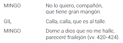 Previamente a que Mingo y Menga decidan convertirse en palaciegos, los pastores critican a sus compañeros por haberles abandonado. Efectivamente, ambos se sienten burlados (vv. 294 y 300); por ello, el rústico amenaza con seguir el mismo camino que Gil y convertirse en cortesano: