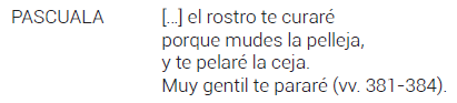 Teniendo en cuenta los pasajes citados, no resultaría descabellado imaginar a Menga y a Pascuala en una posición similar a la del taco de La lozana andaluza. Ahora bien, ¿cómo se representaría esta práctica en escena? Para simular la depilación del rostro de Menga, esta podría llevar postizos que simularan unas cejas muy pobladas de la pastora y que Pascuala, con diversos métodos de depilación, le arrancaría de la frente, dejando visibles unas cejas peladas y arqueadas25.