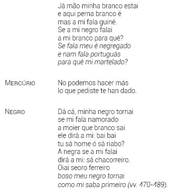 Sin embargo, además de la convención pragmática que atribuye a la deturpación del portugués o del castellano el casi estatuto lingüístico de pigin, cualquiera que sea, se adivina el intento de dejar claro el establecimiento de un código que permita reconocer el habla de moro —que remonta, por lo menos, a la mora Tais de la tragicomedia de las Cortes de Júpiter de Gil Vicente— en otros textos un poco posteriores y de diversos autores, como en el lenguage del cautivo Mahometo del Auto do Duque de Florença, o en frecuentes usos del habla de negro, esa de matriz portuguesa, conforme a su nacionalización.