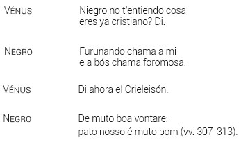 Si Venus no entiende al negro, intentos hay de provocar una buena comunicación entre blancos y negros a lo largo del teatro del Quinientos, aunque sea solo para introducir comicidad y risa. En el Auto das Regateiras, de António Ribeiro Chiado, al no tener conciencia de que el habla de negro es una corruptela de su propio idioma, Pero Vaz llega a pensar que si habla en esa forma convencional se hará entender por la esclava que integrará la dote de su futura nuera. Pero su comadre lo desengaña, ya que la negra habla un portugués sufrible, pues «no es ella tan salvaje»: