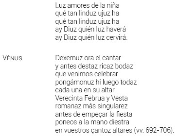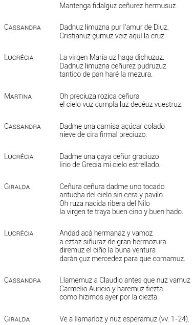 Más interesante es que en ese mismo idioma hablen las diosas griegas y romanas de la farsa de Lusitania, ya mencionada, que dicen venir de Grecia y Egipto. La verdad es que lo que hacen es lo mismo: predecir la mala dicha, en este caso, de la pobre Lusitania destinada a casarse con un inapto para el sexo, quedando, la pobre sin ser maridada: