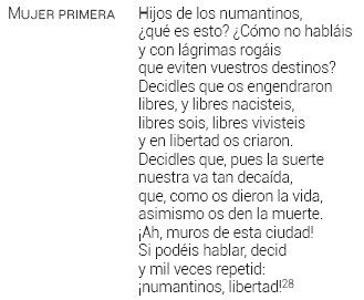 Igualmente, en la adaptación el tema de la maternidad no se desterraba de la faceta femenina. Desarrollado a través de los personajes corales de la Madre primera, Madre segunda y Madre tercera durante la escena undécima de la jornada segunda de la versión, en el texto fuente tan solo aparecía el personaje de la Mujer acompañada por un Hijo con el que dialogaba y una Criatura sin intervención textual29. Con esta variación dramatúrgica se potenciaban las consecuencias trágicas sobre las heroínas de Numancia a modo de lamento de los coros grecolatinos.