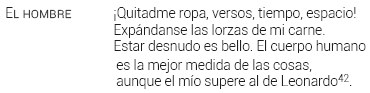 A nivel textual la escena parte de la fuente aunque agregaba una secuencia final que describía parte de la historia de España más allá del Imperio de Felipe II que recoge Cervantes27. Eliminando toda referencia al río Duero, se relataba la guerra civil, la dictadura, la instauración de la democracia con la unión a Europa y, finalmente, se describía la actualidad de España como una «madrastra» que «levanta muros infranqueables» para impedir la entrada de la «emigración del sur». La escena de La mujer-España y El hombre-España concluía con un mensaje desolador que unido a las imágenes que apoyaban los versos y se proyectaban sobre los muros de Numancia configuraba un momento de impacto visual y sonoro de naturaleza apocalíptica.