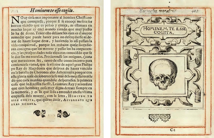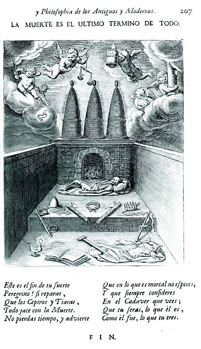 En el riquísimo tesauro de representaciones simbólicas que es la emblemática, podemos hallar numerosos ejemplos que transmiten, también con un fuerte componente visual, este posicionamiento ideológico. Así, tanto en Juan de Borja como en Otto Vaenius se afirma la enseñanza de que ser humano es tener siempre presente el futuro de destrucción que nos espera: conocerse a sí mismo aparece como el saber que somos el pasado de una calavera. Y notemos la importancia que se le da a la influencia del recordatorio visual y tangible; la vista aparece como lo que más efectivamente incide en la consciencia.