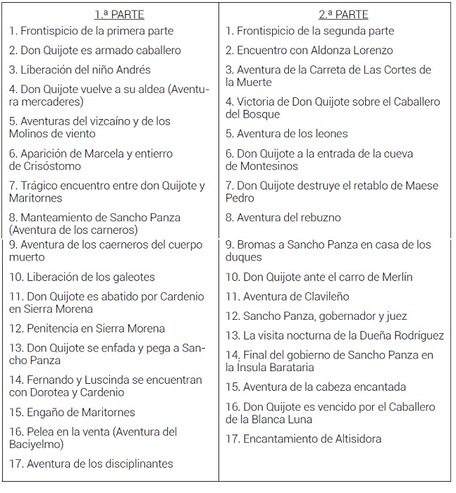 Con respecto a los grabados, como hemos dicho, cada una de las dos partes contiene dieciséis estampas más el frontispicio, lo que hace un total de 34 ilustraciones. Los episodios escogidos por parte de los editores son los que se muestran en la tabla situada a continuación: