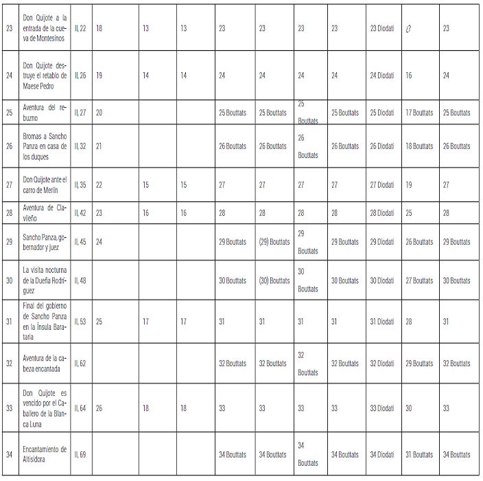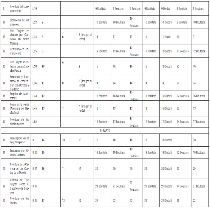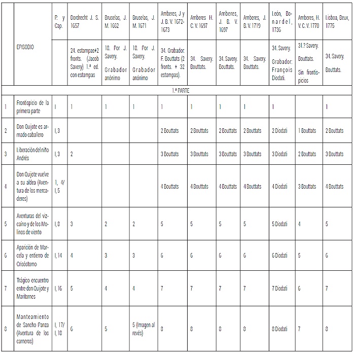 Con vistas a facilitar la comprensión y los vínculos entre unas y otras ediciones en lo que a las estampas se refiere, nos disponemos a ofrecer a continuación una tabla donde se puede seguir el proceso de las ediciones ilustradas del Quijote desde 1657 hasta 1775, así como el lugar que ocupa cada uno de los grabados: