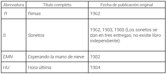 En su edición de las Poesías completas de José Bergamín, Nigel Dennis separa en el primer poemario del autor las rimas y los sonetos (por afianzar la trascendencia de los segundos). Citamos siguiendo esta disposición: la tabla ofrece un listado de las abreviaturas empleadas y la fecha original de publicación del libro al que corresponden.