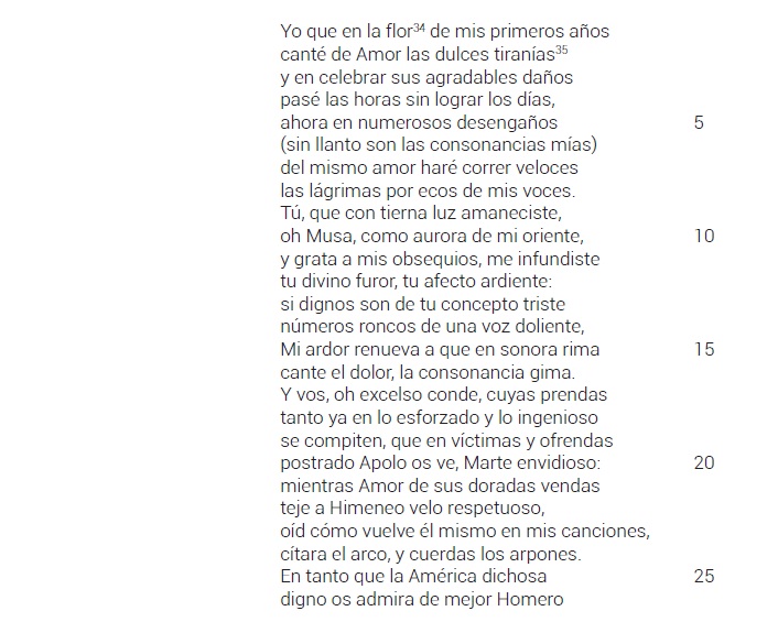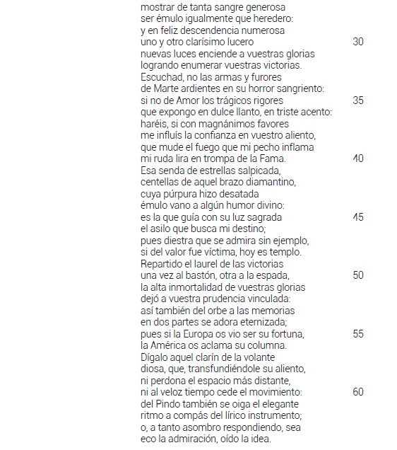 In the fifth stanza, the viceroy is asked to listen to what he is not usually used to listen as a military man: the weapons and fury of Mars, but the tragic rigors of love that the poet will sing with sweet crying and a sad accent. The Count of Monclova is a true patron, as he encourages the poets until they can hear the trumpet of Fame46.