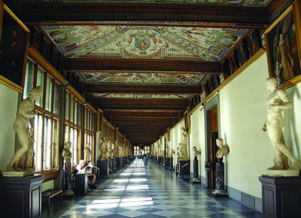 Gli Uffizi vengono costruiti tra il 1561 e il 1581 su progetto di Giorgio Vasari per volontà del duca Cosimo de’ Medici, come nuova sede per le magistrature del Ducato di Firenze: fin dall’inizio, però, l’ultimo piano fu destinato all’uso privato del duca, in particolare come luogo privilegiato per ospitare le sue collezioni d’arte. Gran parte di ciò che oggigiorno si trova all’interno del museo è frutto dell’amore per l’arte che caratterizza questa famiglia di mercanti e banchieri divenuti prima signori e poi duchi della città, nonostante il fatto che l’allestimento voluto fin dal XVIII secolo per volontà di Pietro Leopoldo di Asburgo-Lorena abbia un intento didattico-cronologico e non rispecchi le soluzioni espositive scelte dai vari membri della famiglia Medici. Un’eccezione è senza dubbio il primo corridoio, il cui aspetto attuale rispecchia fedelmente quello della fine del XVI secolo indagato e ricostruito filologicamente a partire dagli ultimi decenni del ‘900. In particolare, le due serie di dipinti che si snodano per tutta la lunghezza del corridoio, continuando anche nelle ali successive, sono per noi della massima importanza non tanto per la loro qualità quanto per la capacità di restituirci la visione del mondo nel pensiero di Cosimo I e dei suoi figli Francesco e Ferdinando.