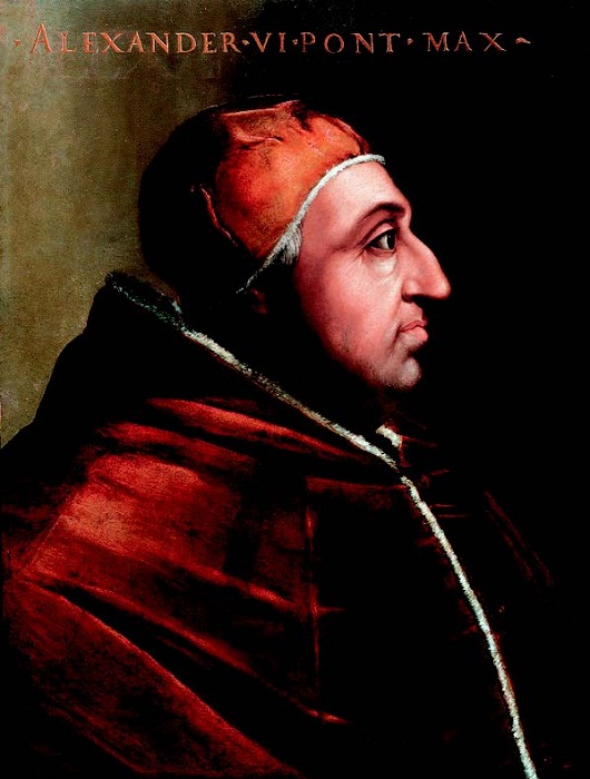 Tra i papi spicca invece Alessandro VI, al secolo Rodrigo Borgia, sicuramente uno dei personaggi più discussi, insieme ai suoi figli, della storia e delle cronache dell’ultimo scorcio del XV secolo. Il ritratto degli Uffizi, probabilmente derivato dal perduto affresco del Pinturicchio realizzato per l’appartamento del papa in Vaticano e copiato in epoca antica da Pietro Facchetti, ci restituisce l’idea di un uomo pingue, ma di aspetto volitivo ed intelligente. Assai raffinati i toni del rosso dell’abito che ci restituiscono la finezza del velluto. Nei rapporti di Rodrigo Borgia con Firenze non si può non ricordare il ruolo che ebbe nella condanna a morte di fra’ Girolamo Savonarola, dopo che questi aveva realizzato a Firenze il sogno di una repubblica teocratica in seguito alla cacciata dei Medici e alla condanna all’esilio dei figli di Lorenzo il Magnifico nel 1494.