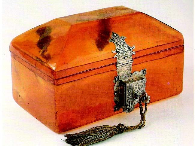 A carapaça da tartaruga constituía um outro material de origem natural muito usado na realização de objetos de devoção e de luxo conservados nas casas religiosas. Falamos das incrustações de tartaruga em cruzes, estantes, rosários, caixas para as hóstias ou relíquias ou ainda para guardar produtos de uso quotidiano, como óculos, ou tabaco4.