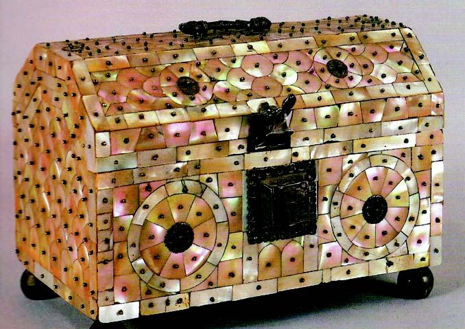 4. Cofre, madrepérola, prata, teca, interior lacado a vermelho, 17x23x13, Índia, séc. XVII, Museu Nacional de Arte Antiga, Lisboa.