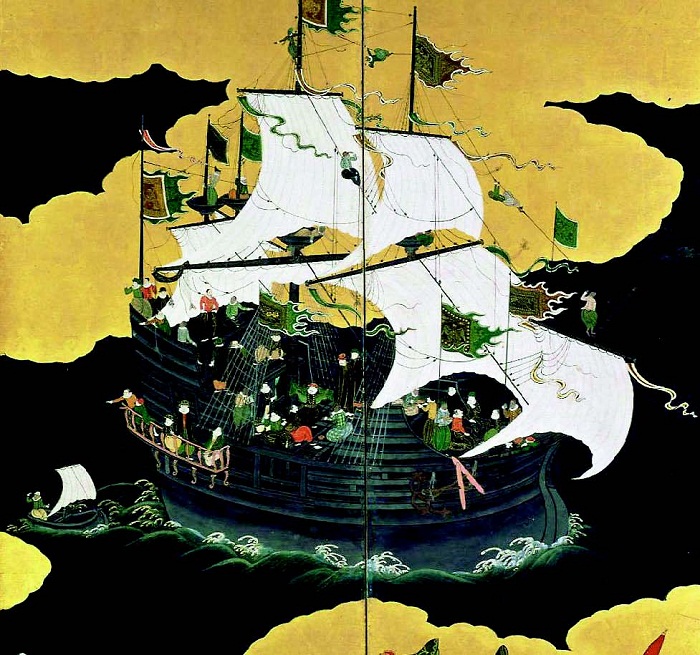 6. Biombo Namban com a representação da Nau Negra, atr. A Kano Naizen, finais séc. XVI-início do séc. XVII, Kobe, Kobe City Museum, <https://www.commons.wikimedia.org/wiki/File:NanbanCarrack.jpg>.