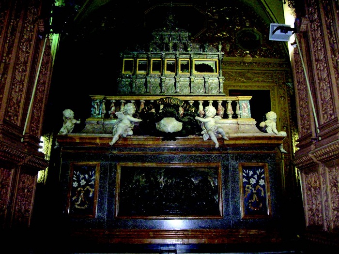 7. Túmulo-relicário em prata com o corpo incorrupto de S. Francisco Xavier, artesãos indianos, 1636-1637, sobre estrutura em pietre dure, mármore e prata por Giovanni Battista Foggini, 1698, Goa, Basílica do Bom Jesus. Fotografia da autora.