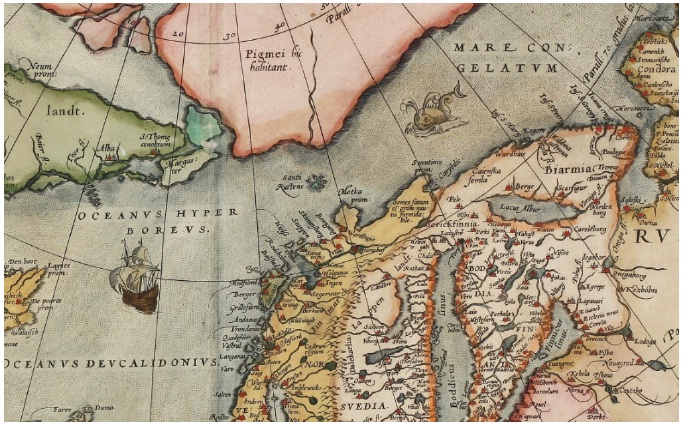 Hasta ahora no se ha apersonado figura ni histórica ni literaria que tenga pinta de ser la base utilizada por la imaginación cervantina al crear al rey Cratilo, tío de Sulpicia en el segundo libro del Persiles (caps. 18 y 20) y amable anfitrión del protagonista. El recibimiento tan amistoso y desinteresado que les da a los dos parece ser uno de los motivos principales de su presencia en la novela, formando un marcado contraste con la conducta viciosa del rey Policarpo al detener en su reino a Sigismunda y Persiles1. Aunque el reino de Cratilo, denominado en la novela como Bituania, sea de identificación dudosa, la trama indica bastante claramente, como han mostrado Isabel Lozano Renieblas y Carlos Romero, que se llamará así no por Lituania, como a primera vista podría sugerir el misterioso topónimo, sino en relación con una costa escandinava y más árctica 2. Un mapa (c. 1570) de Abrahán Ortelius, cartógrafo real de Felipe II, lleva por título Septentrionalium Regionum Descriptio; no incluye ningún país llamado Bituania, pero sí Biarmia. Este está ubicado a la orilla del Mare Congelatum y colinda con el extremo norteño de la costa noroeste de Noruega. ¿Se trata de una casualidad?