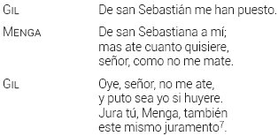Como es de esperar, ante la inminencia del sufrimiento algunos graciosos se muestran pusilánimes. La cobardía constituye una de las características de estos individuos, lo que ya señaló Fernández Montesinos en un clásico estudio sobre la figura del donaire en el teatro de Lope de Vega5. A veces piden un castigo menos severo o agradecen no ser sancionados de peor manera. Por ejemplo, en La vida es sueño, al sorprender a Rosaura y Clarín en la torre de Segismundo, Clotaldo manda a sus hombres «o prendeldes o mataldes», a lo que responde el gracioso: «pues que nos dais a escoger / el prendernos es más fácil»6. Nadie le replica, como si no hubiera sido oído. También es ignorado el comentario de los villanos Gil y Menga, quienes son atados a un árbol por los bandoleros que acompañan a Eusebio en La devoción de la cruz: