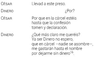 También el gracioso de Mejor está que estaba, Dinero, hace un chiste cuando escucha la sentencia que le impone don César, que tiene el cargo de potestad, es decir, de administrador de justicia15. Dinero ha sido detenido porque es el criado de don Carlos, a quien buscan por haber asesinado a Licio, sobrino precisamente de
